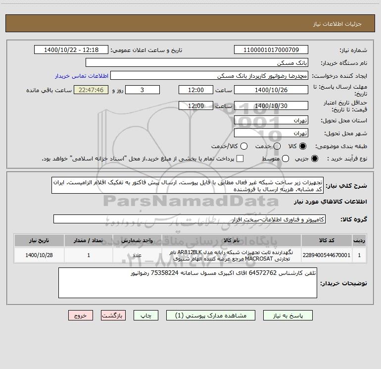 استعلام بها و موضوع استعلام استعلام تجهیزات زیر ساخت شبکه غیر فعال مطابق با فایل پیوست. ارسال پیش فاکتور به تفکیک اقلام الزامیست. ایران کد مشابه. هزینه ارسال با فروشنده به اطلاع کلیه شرکت‌ها و افراد متخصص واجد شرایط می‌رساند، آگهی گذار در نظر دارد از طریق استعلام بها، نسبت به انتخاب و دریافت پیشنهادات اقدام نماید. این استعلام با کد آگهی ثبت شده در سامانه خبرگزاری پارس نماد : 4150150 منتشر شده است. مشخصات استعلام : تاریخ شروع استعلام: 1400/10/22 آخرین مهلت ارسال پیشنهاد قیمت : 1400/10/25 و محل اجرای پروژه : استان تهران میباشد. استعلام قیمت مورد درخواست : استعلام تجهیزات زیر ساخت شبکه غیر فعال مطابق با فایل پیوست. ارسال پیش فاکتور به تفکیک اقلام الزامیست. ایران کد مشابه. هزینه ارسال با فروشنده با دسته‌بندی‌های تخصصی و گروه های مرتبط : کامپیوتر, اینترنت شبکه, استعلام اطلاع رسانی میگردد. شرایط شرکت در استعلام آنلاین : ابتدا ثبت نام در سامانه استعلام پارس نماد و تکمیل مدارک موردنیاز و بارگذاری در سامانه رعایت تمامی ضوابط و الزامات مندرج در اسناد استعلام است.
