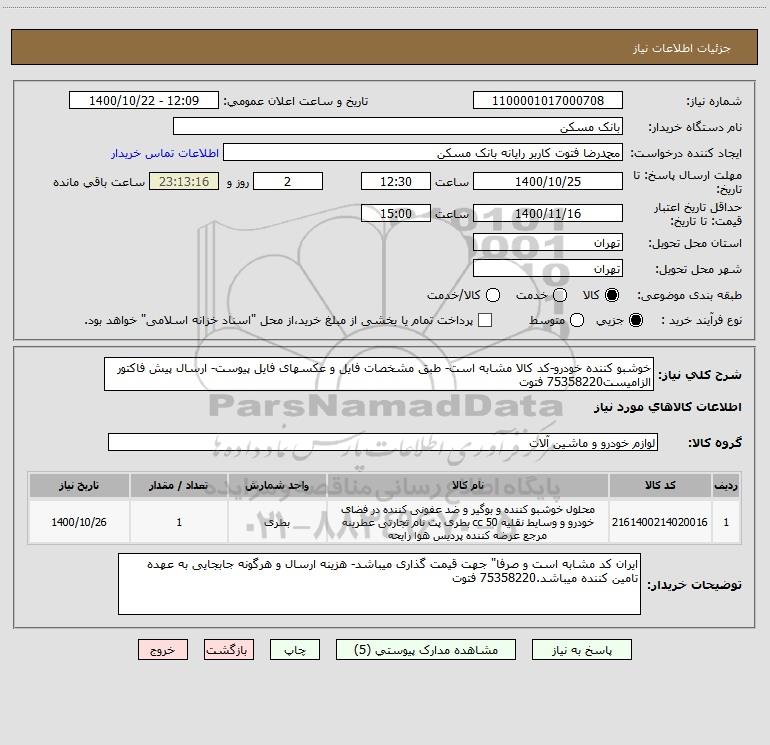 شرح کلی نیاز: خوشبو کننده خودرو-کد کالا مشابه است- طبق مشخصات فایل و عکسهای فایل پیوست- ارسال پیش فاکتور الزامیست75358220 فتوت