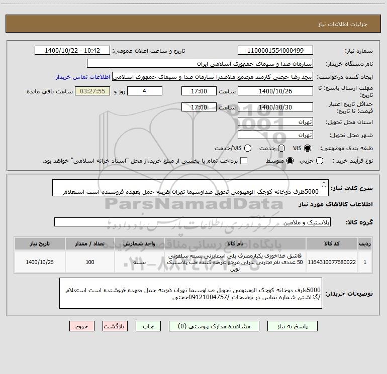 توضیحات خریدار: 5000ظرف دوخانه کوچک الومینومی تحویل صداوسیما تهران هزینه حمل بعهده فروشنده است استعلام /گذاشتن شماره تماس در نوضیحات /09121004757حجتی