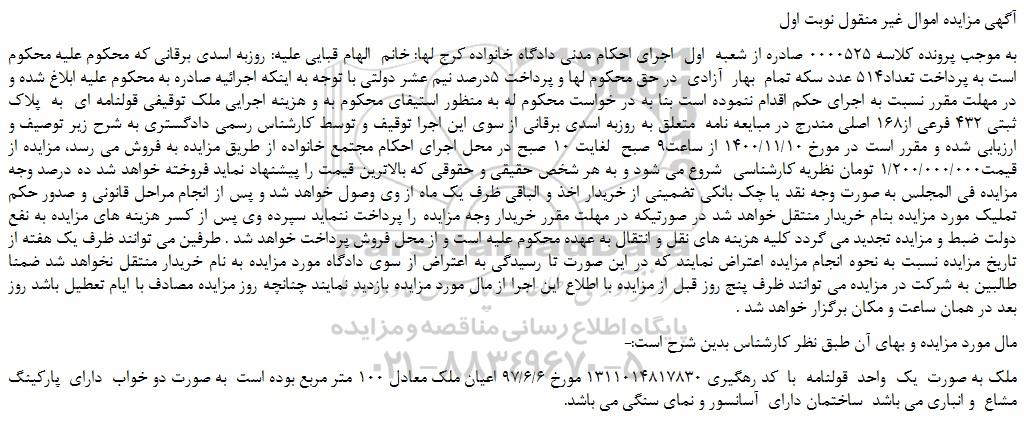 به موجب پرونده کلاسه 0000525 صادره از شعبه اول اجرای احکام مدنی دادگاه خانواده کرج لها: خانم الهام قبایی علیه: روزبه اسدی برقانی که محکوم علیه محکوم است به پرداخت تعداد514 عدد سکه تمام بهار آزادی در حق محکوم لها و پرداخت 5درصد نیم عشر دولتی با توجه به اینکه اجرائیه صادره به محکوم علیه ابلاغ شده و در مهلت مقرر نسبت به اجرای حکم اقدام ننموده است بنا به در خواست محکوم له به منظور استیفای محکوم به و هزینه اجرایی ملک توقیفی قولنامه ای به پلاک ثبتی 432 فرعی از168 اصلی مندرج در مبایعه نامه متعلق به روزبه اسدی برقانی از سوی این اجرا توقیف و توسط کارشناس رسمی دادگستری به شرح زیر توصیف و ارزیابی شده و مقرر است در مورخ 1400/11/10 از ساعت9 صبح لغایت 10 صبح در محل اجرای احکام مجتمع خانواده از طریق مزایده به فروش می رسد، مزایده از قیمت1/200/000/000 تومان نظریه کارشناسی شروع می شود و به هر شخص حقیقی و حقوقی که بالاترین قیمت را پیشنهاد نماید فروخته خواهد شد ده درصد وجه مزایده فی المجلس به صورت وجه نقد یا چک بانکی تضمینی از خریدار اخذ و الباقی ظرف یک ماه از وی وصول خواهد شد و پس از انجام مراحل قانونی و صدور حکم تملیک مورد مزایده بنام خریدار منتقل خواهد شد در صورتیکه در مهلت مقرر خریدار وجه مزایده را پرداخت ننماید سپرده وی پس از کسر هزینه های مزایده به نفع دولت ضبط و مزایده تجدید می گردد کلیه هزینه های نقل و انتقال به عهده محکوم علیه است و از محل فروش پرداخت خواهد شد . طرفین می توانند ظرف یک هفته از تاریخ مزایده نسبت به نحوه انجام مزایده اعتراض نمایند که در این صورت تا رسیدگی به اعتراض از سوی دادگاه مورد مزایده به نام خریدار منتقل نخواهد شد ضمنا طالبین به شرکت در مزایده می توانند ظرف پنج روز قبل از مزایده با اطلاع این اجرا از مال مورد مزایده بازدید نمایند چنانچه روز مزایده مصادف با ایام تعطیل باشد روز بعد در همان ساعت و مکان برگزار خواهد شد .