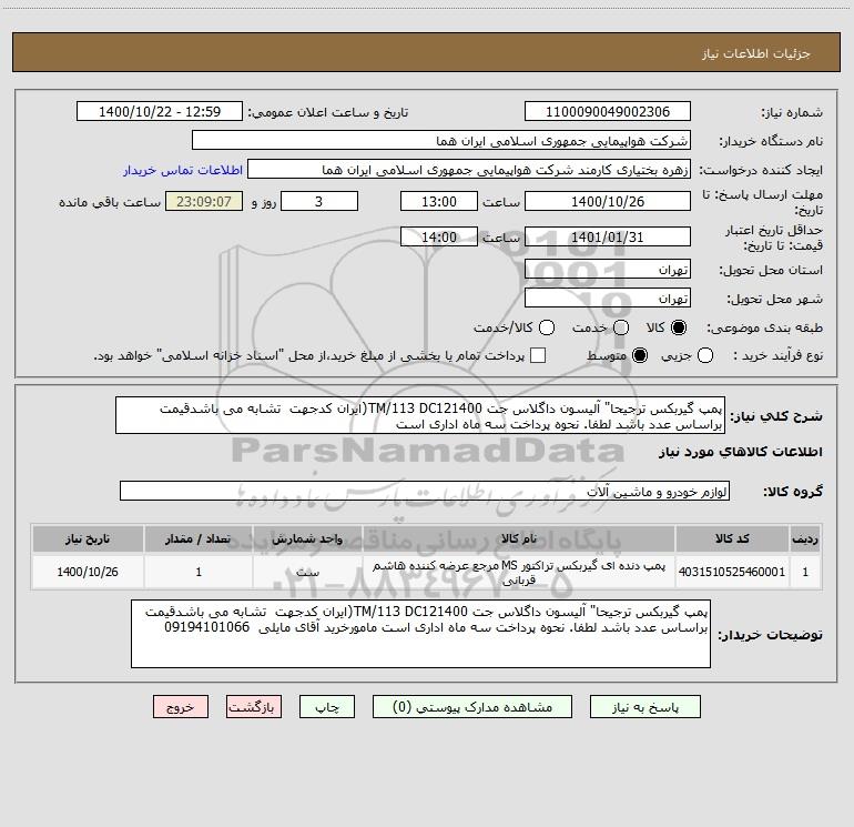 شرح کلی نیاز: پمپ گیربکس ترجیحا" آلیسون داگلاس جت TM/113 DC121400(ایران کدجهت تشابه می باشدقیمت براساس عدد باشد لطفا. نحوه پرداخت سه ماه اداری است
