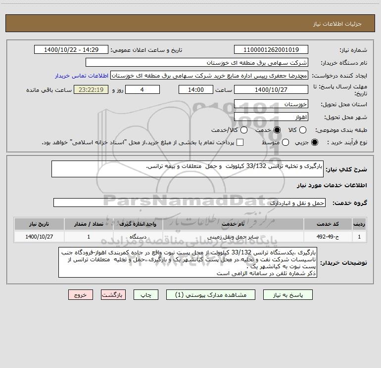 شرح کلی نیاز: بارگیری و تخلیه ترانس 33/132 کیلوولت و حمل متعلقات و بیمه ترانس.