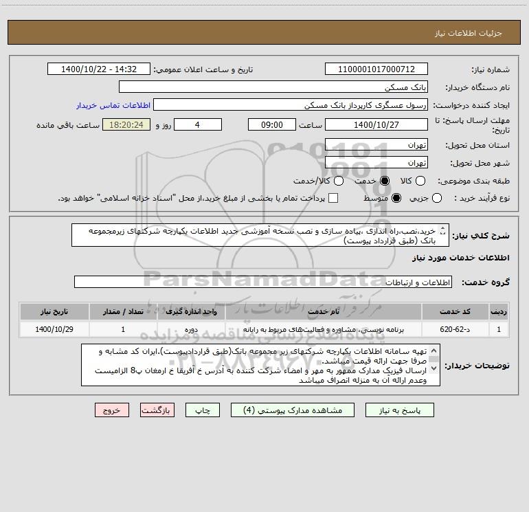 توضیحات خریدار:تهیه سامانه اطلاعات یکپارچه شرکتهای زیر مجموعه بانک(طبق قراردادپیوست).ایران کد مشابه و صرفا جهت ارائه قیمت میباشد. ارسال فیزیک مدارک ممهور به مهر و امضاء شرکت کننده به آدرس خ آفریقا خ ارمغان پ8 الزامیست وعدم ارائه آن به منزله انصراف میباشد