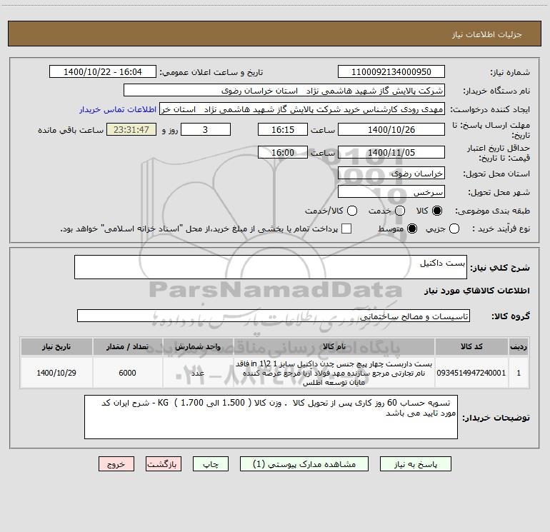 نام دستگاه خریدار:شرکت پالایش گاز شهید هاشمی نژاد استان خراسان رضوی