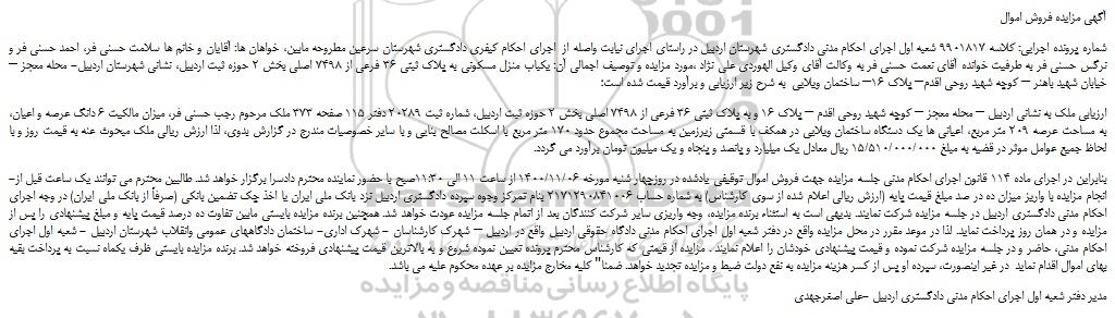 شماره پرونده اجرایی: کلاسه 9901817 شعبه اول اجرای احکام مدنی دادگستری شهرستان اردبیل در راستای اجرای نیابت واصله از اجرای احکام کیفری دادگستری شهرستان سرعین مطروحه مابین، خواهان ها: آقایان و خانم ها سلامت حسنی فر، احمد حسنی فر و نرگس حسنی فر به طرفیت خوانده آقای نعمت حسنی فر به وکالت آقای وکیل الهوردی علی نژاد ،مورد مزایده و توصیف اجمالی آن: یکباب منزل مسکونی به پلاک ثبتی 36 فرعی از 7498 اصلی بخش 2 حوزه ثبت اردبیل، نشانی شهرستان اردبیل- محله معجز – خیابان شهید باهنر – کوچه شهید روحی اقدم– پلاک 16– ساختمان ویلایی به شرح زیر ارزیابی و برآورد قیمت شده است؛