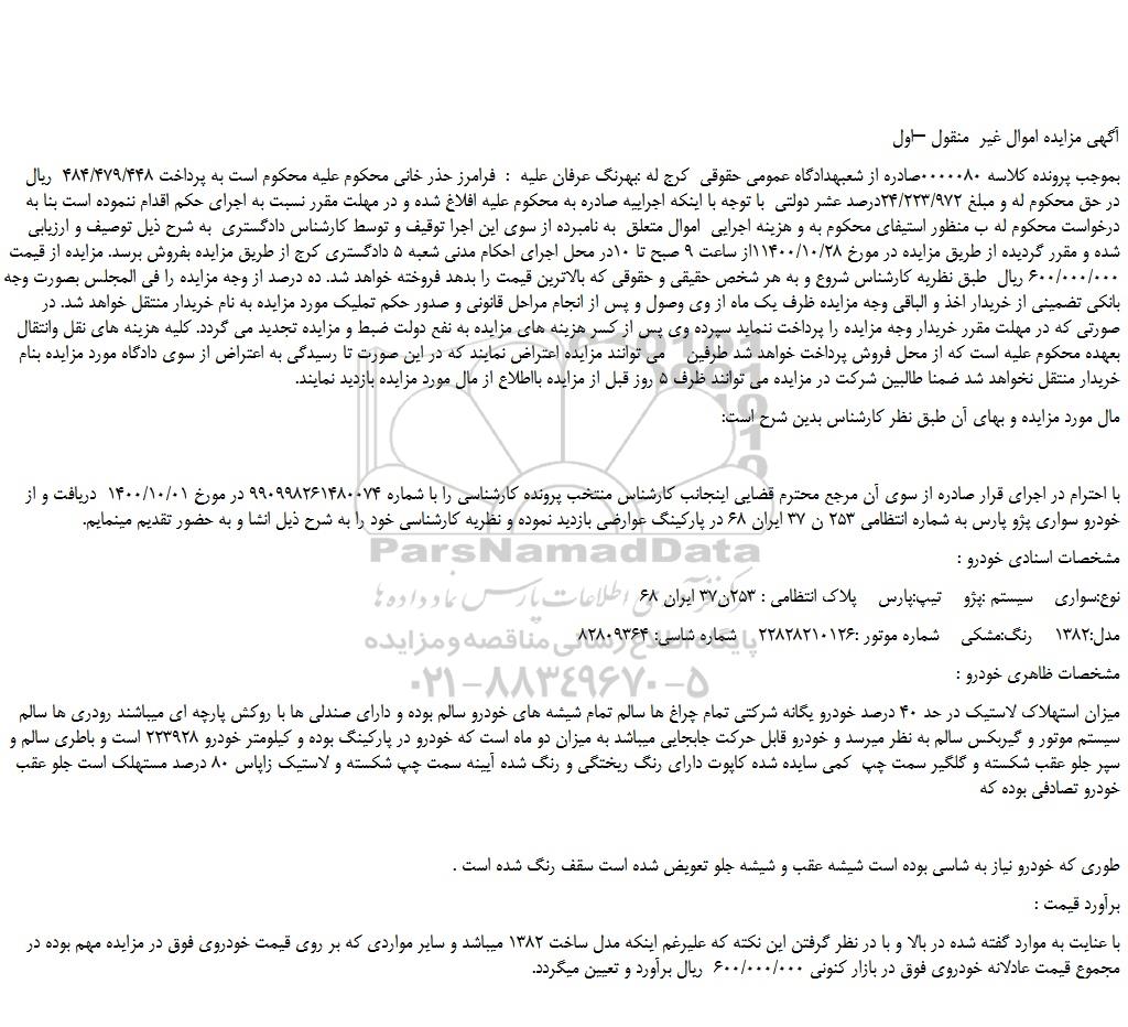 مزایده،مزایده فروش  خودرو سواری پژو پارس