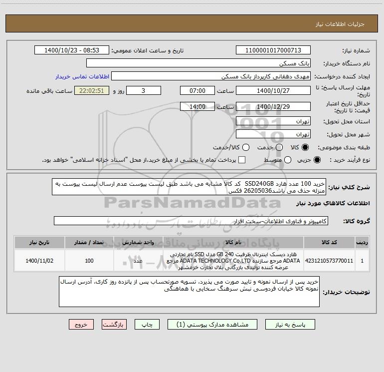 استعلام خرید 100 عدد هارد SSD240GB کد کالا مشابه می باشد طبق لیست پیوست عدم ارسال لیست پیوست به منزله حذف می باشد26205036 فکس, استعلام خرید 100 عدد هارد SSD240GB کد کالا مشابه می باشد طبق لیست پیوست عدم ارسال لیست پیوست به منزله حذف می باشد26205036 فکس