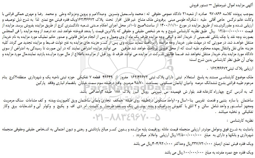 بموجب پرونده کلاسه 970866 صادره از شعبه21 دادگاه عمومی حقوقی له : محمد واسمعیل ونسرین وعبدالامیر و پروین وعزیزاله وعلی و محمد رضا و مهری همگی قرائتی با وکالت خانم نرگس حاجی آقائی علیه : شکراله طوسی مبنی برفروش ملک مشاع غیر قابل افراز تحت پلاک 162/46672ویک فقره فیش حج تمتع لذا به شرح ذیل توصیف و ارزیابی شده و مقررگردیده از طریق مزایده در مورخ 1400/11/10 از ساعت9صبح تا10در محل اجرای احکام مدنی شعبه دادگستری کرج از طریق مزایده بفروش برسد. مزایده از قیمت 12/500/000/000 ریال طبق نظریه کارشناس شروع و به هر شخص حقیقی و حقوقی که بالاترین قیمت را بدهد فروخته خواهد شد. ده درصد از وجه مزایده را فی المجلس بصورت وجه نقد یا چک بانکی تضمینی از خریدار اخذ و الباقی وجه مزایده ظرف یک ماه از وی وصول و پس از انجام مراحل قانونی و صدور حکم تملیک مورد مزایده به نام خریدار منتقل خواهد شد. در صورتی که در مهلت مقرر خریدار وجه مزایده را پرداخت ننماید سپرده وی پس از کسر هزینه های مزایده به نفع دولت ضبط و مزایده تجدید می گردد. کلیه هزینه های نقل وانتقال بعهده محکوم علیه است که از محل فروش پرداخت خواهد شد طرفین می توانند مزایده اعتراض نمایند که در این صورت تا رسیدگی به اعتراض از سوی دادگاه مورد مزایده بنام خریدار منتقل نخواهد شد ضمنا طالبین شرکت در مزایده می توانند ظرف 5 روز قبل از مزایده بااطلاع از مال مورد مزایده بازدید نمایند.مال مورد مزایده و بهای آن طبق نظر کارشناس بدین شرح است: