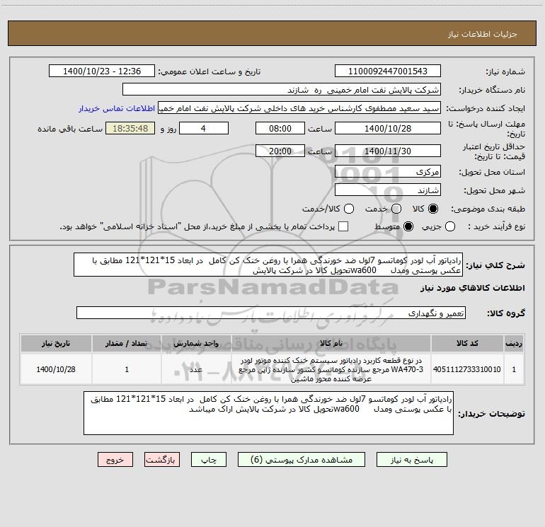 شرح کلی نیاز: رادیاتور آب لودر کوماتسو 7لول ضد خورندگی همرا با روغن خنک کن کامل در ابعاد 15*121*121 مطابق با عکس پوستی ومدل wa600تحویل کالا در شرکت پالایش