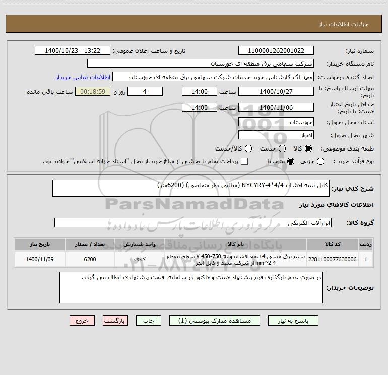 شرح کلی نیاز: کابل نیمه افشان NYCYRY-4*4/4 (مطابق نظر متقاضی) (6200متر)