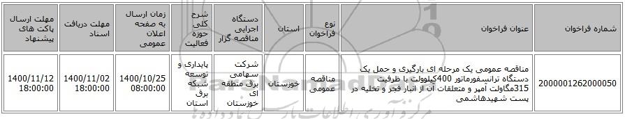 | 2000001262000050 | مناقصه عمومی یک مرحله ای بارگیری و حمل یک دستگاه ترانسفورماتور 400کیلوولت با ظرفیت 315مگاولت آمپر و متعلقات آن از انبار فجر و تخلیه در پست شهیدهاشمی | مناقصه عمومی | خوزستان | شرکت سهامی برق منطقه ای خوزستان | پایداری و توسعه شبکه برق استان | 1400/10/25 08:00:00 | 1400/11/02 18:00:00 | 1400/11/12 18:00:00 |