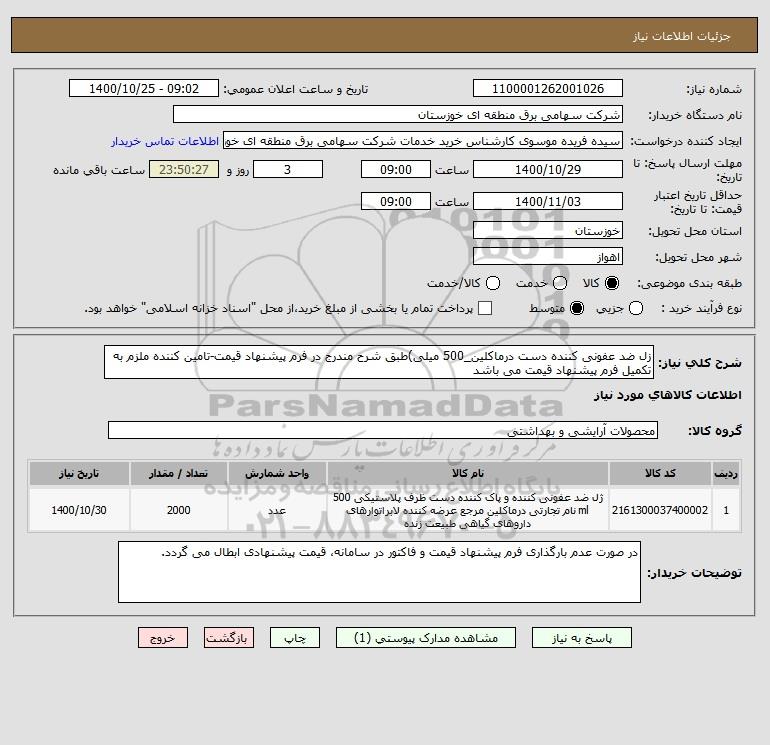 شرح کلی نیاز: زل ضد عفونی کننده دست درماکلین_500 میلی)طبق شرح مندرج در فرم پیشنهاد قیمت-تامین کننده ملزم به تکمیل فرم پیشنهاد قیمت می باشد