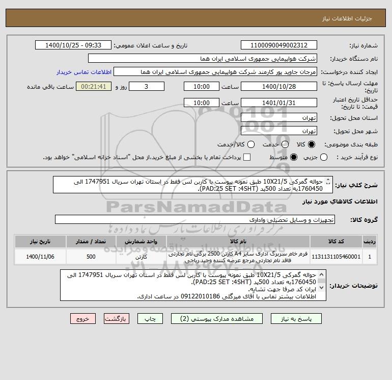 شرح کلی نیاز: حواله گمرکی 10X21/5 طبق نمونه پیوست با کاربن لس فقط در استان تهران سریال 1747951 الی 1760450به تعداد 500پد (PAD:25 SET :4SHT).
