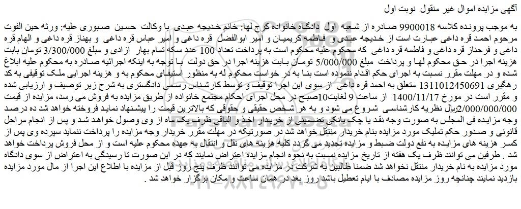 به موجب پرونده کلاسه 9900018 صادره از شعبه اول دادگاه خانواده کرج لها: خانم خدیجه عبدی با وکالت حسین صبوری علیه: ورثه حین الفوت مرحوم احمد قره داغی عبارت است از خدیجه عبدی و فاطمه کریمیان و امیر ابوالفضل قره داغی و امیر عباس قره داغی و بهناز قره داغی و الهام قره داغی و فرحناز قره داغی و فاطمه قره داغی که محکوم علیه محکوم است به پرداخت تعداد 100 عدد سکه تمام بهار ازادی و مبلغ 3/300/000 تومان بابت هزینه اجرا در حق محکوم لها و پرداخت مبلغ 5/000/000 تومان بابت هزینه اجرا در حق دولت با توجه به اینکه اجرائیه صادره به محکوم علیه ابلاغ شده و در مهلت مقرر نسبت به اجرای حکم اقدام ننموده است بنا به در خواست محکوم له به منظور استیفای محکوم به و هزینه اجرایی ملک توقیفی به کد رهگیری 1311012450691 متعلق به احمد قره داغی از سوی این اجرا توقیف و توسط کارشناس رسمی دادگستری به شرح زیر توصیف و ارزیابی شده و مقرر است در مورخ 1400/11/17 از ساعت 9 لغایت10صبح در محل اجرای احکام مجتمع خانواده از طریق مزایده به فروش می رسد، مزایده از قیمت 2/000/000/000ریال نظریه کارشناسی شروع می شود و به هر شخص حقیقی و حقوقی که بالاترین قیمت را پیشنهاد نماید فروخته خواهد شد ده درصد وجه مزایده فی المجلس به صورت وجه نقد یا چک بانکی تضمینی از خریدار اخذ و الباقی ظرف یک ماه از وی وصول خواهد شد و پس از انجام مراحل قانونی و صدور حکم تملیک مورد مزایده بنام خریدار منتقل خواهد شد در صورتیکه در مهلت مقرر خریدار وجه مزایده را پرداخت ننماید سپرده وی پس از کسر هزینه های مزایده به نفع دولت ضبط و مزایده تجدید می گردد کلیه هزینه های نقل و انتقال به عهده محکوم علیه است و از محل فروش پرداخت خواهد شد . طرفین می توانند ظرف یک هفته از تاریخ مزایده نسبت به نحوه انجام مزایده اعتراض نمایند که در این صورت تا رسیدگی به اعتراض از سوی دادگاه مورد مزایده به نام خریدار منتقل نخواهد شد ضمنا طالبین به شرکت در مزایده می توانند ظرف پنج روز قبل از مزایده با اطلاع این اجرا از مال مورد مزایده بازدید نمایند چنانچه روز مزایده مصادف با ایام تعطیل باشد روز بعد در همان ساعت و مکان برگزار خواهد شد .