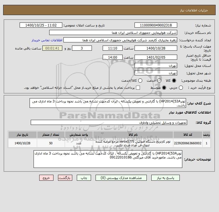 شرح کلی نیاز: تونرHP2014(53A) با گارانتی و تعویض یکساله . ایران کدجهت تشابه می باشد نحوه پرداخت 3 ماه اداری می باشد.
