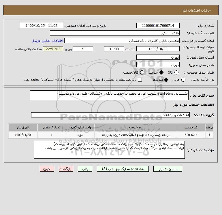 شرح کلی نیاز: پشتیبانی نرمافزاری و سخت افزاری تجهیزات خدمات بانکی روشندلان (طبق قرارداد پیوست)