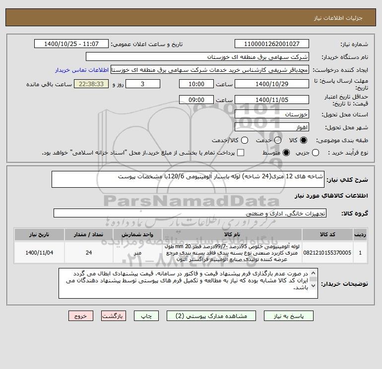شرح کلی نیاز: شاخه های 12 متری(24 شاخه) لوله باسبار آلومینیومی 120/6با مشخصات پیوست
