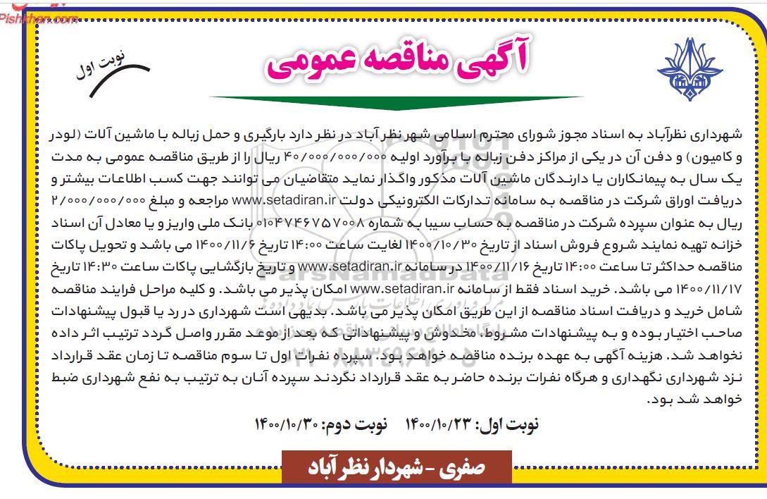 شهرداری نظرآباد در نظر دارد بارگیری و حمل زباله با ماشین آلات (لودر و کامیون) و دفن آن در یکی از مراکز دفن زباله با برآورد اولیه 40.000.000.000 ریال را از طریق مناقصه عمومی به مدت یک سال به پیمانکاران یا دارندگان ماشین آلات مذکور واگذار نماید. متقاضیان می توانند جهت کسب اطلاعات بیشتر و همچنین دریافت اوراق شرکت در مناقصه به سامانه ستاد مراجعه و مبلغ 2.000.000.000 ریال به عنوان سپرده شرکت در مناقصه به حساب سیبا به شماره 0104746757008 نزد بانک ملی واریز و یا معادل آن اسناد خزانه تهیه نمایند. شروع فروش اسناد از تاریخ 1400.10.30 لغایت ساعت 14 تاریخ 1400.11.6 می باشد و تحویل پاکات مناقصات حداکثر تا ساعت 14 مورخ 1400.11.16 در سامانه ستاد و تاریخ بازگشایی پاکات ساعت 14:30 مورخ 1400.11.17 می باشد.