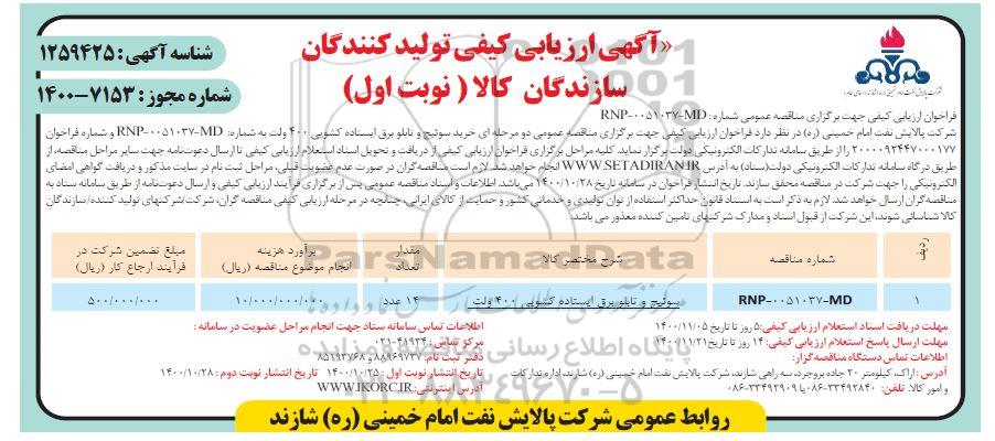 ارزیابی کیفی خرید سوئیچ و تابلو برق ایستاده کشویی ۴۰۰ ولت از کلیه افراد متخصص و شرکتها واجد شرایط دعوت به عمل میآید در مناقصه با کد خبرگزاری پارس نماد: 4156815 شرکت نمایند.