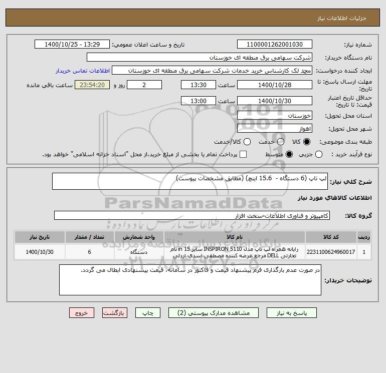 شرح کلی نیاز: لپ تاپ (6 دستگاه - 15.6 اینچ) (مطابق مشخصات پیوست)