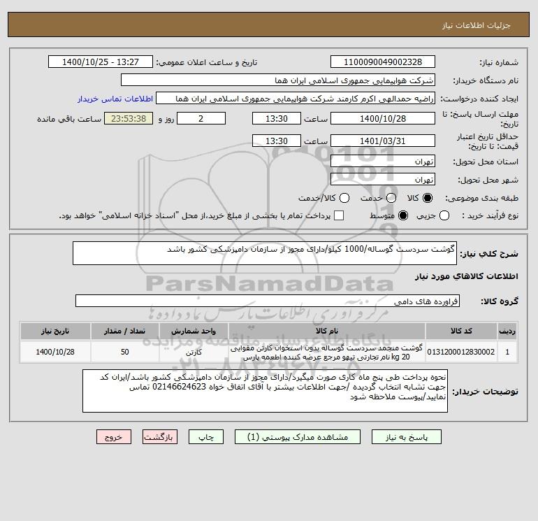 شرح کلی نیاز: گوشت سردست گوساله/1000 کیلو/دارای مجوز از سازمان دامپزشکی کشور باشد