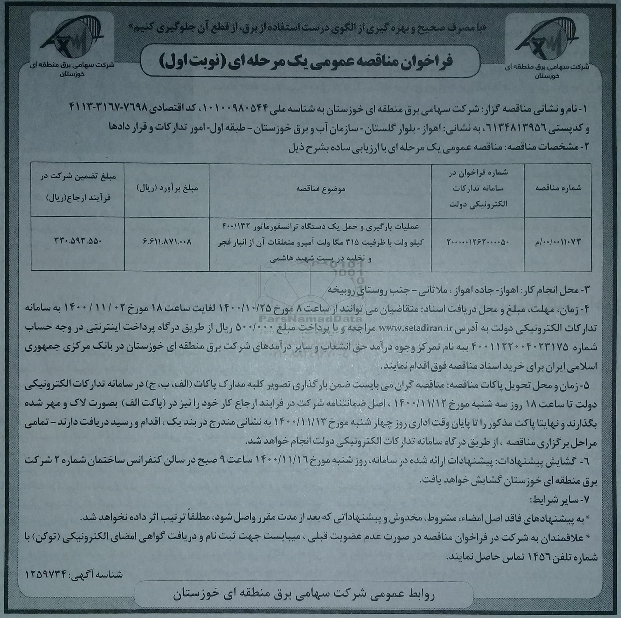 | 00/0061013/م | 2000001262000050 | عملیات بارگیری و حمل یک دستگاه ترانسفورماتور 400.132 کیلوولت با ظرفیت 315 مگاولت امپرو متعلقات ان از انبار فجر و تخلیه در پست شهید هاشمی |