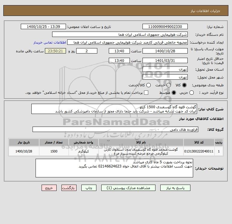 شرح کلی نیاز: گوشت قلوه گاه گوسفندی 1500 کیلو ایران کد جهت تشابه میباشد - شرکت باید حتما دارای مجوز از سازمان دامپزشکی کشور باشد