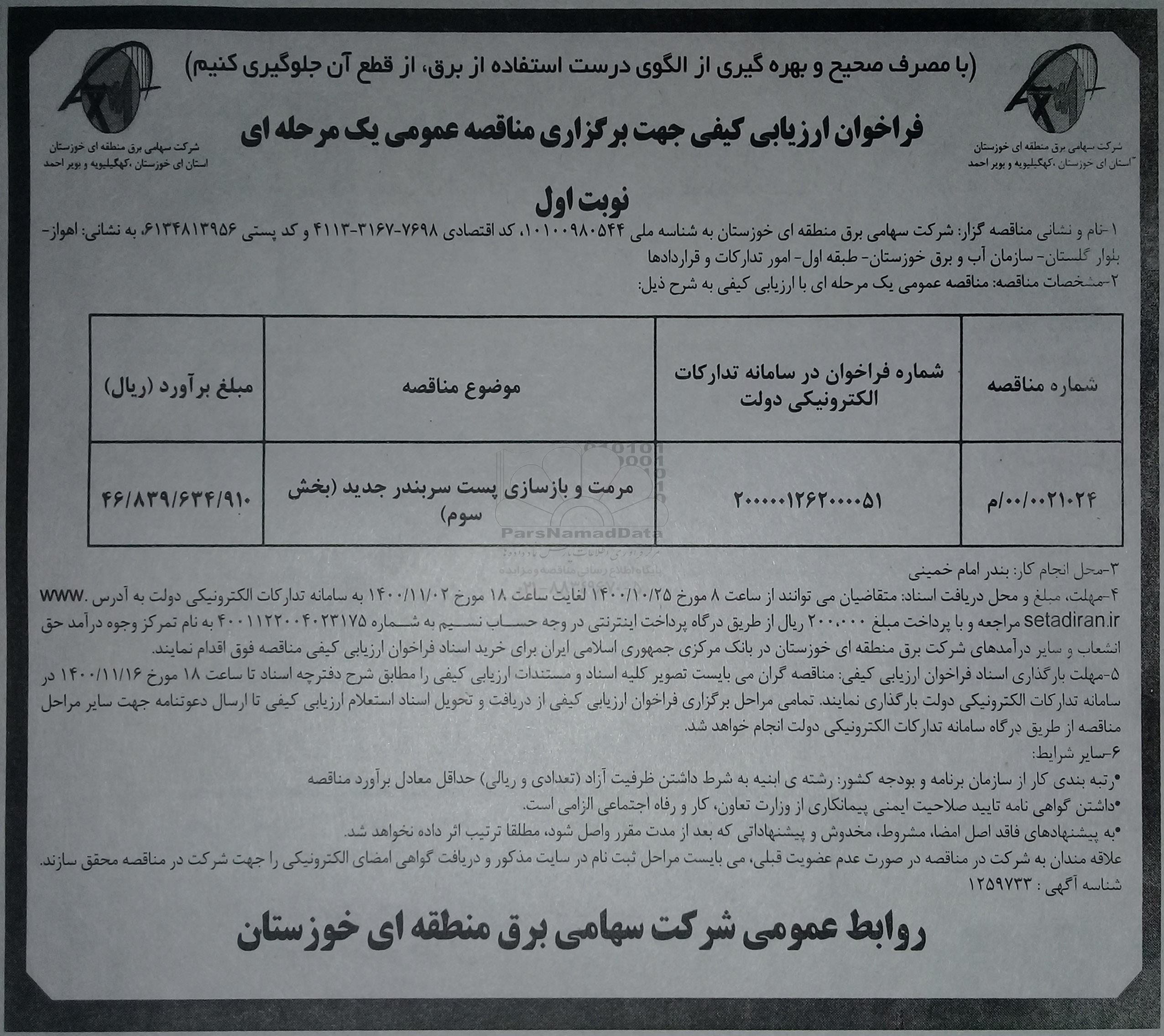 1. نام و نشانی مناقصه گزار: شرکت سهامی برق منطقه ای خوزستان به شناسه ملی
