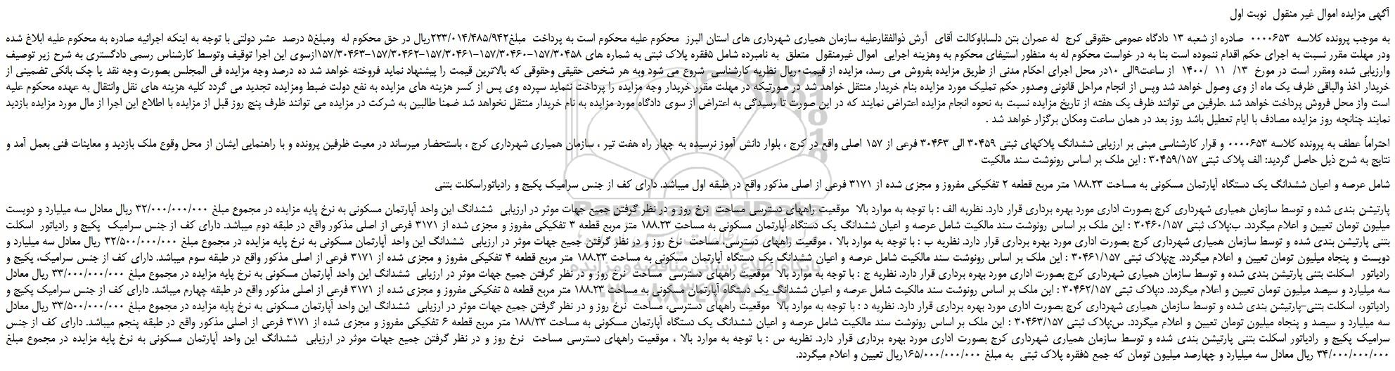 پارتیشن بندی شده و توسط سازمان همیاری شهرداری کرج بصورت اداری مورد بهره برداری قرار دارد. نظریه الف : با توجه به موارد بالا  موقعیت راههای دسترسی مساحت  نرخ روز و در نظر گرفتن جمیع جهات موثر در ارزیابی  ششدانگ این واحد آپارتمان مسکونی به نرخ پایه مزایده در مجموع مبلغ 32/000/000/000 ریال معادل سه میلیارد و دویست میلیون تومان تعیین و اعلام میگردد. ب:پلاک ثبتی 30460/157 : این ملک بر اساس رونوشت سند مالکیت شامل عرصه و اعیان ششدانگ یک دستگاه آپارتمان مسکونی به مساحت 188.23 متر مربع قطعه 3 تفکیکی مفروز و مجزی شده از 3171 فرعی از اصلی مذکور واقع در طبقه دوم میباشد. دارای کف از جنس سرامیک  پکیج و رادیاتور  اسکلت بتنی پارتیشن بندی شده و توسط سازمان همیاری شهرداری کرج بصورت اداری مورد بهره برداری قرار دارد. نظریه ب : با توجه به موارد بالا ، موقعیت راههای دسترسی، مساحت  نرخ روز و در نظر گرفتن جمیع جهات موثر در ارزیابی  ششدانگ این واحد آپارتمان مسکونی به نرخ پایه مزایده در مجموع مبلغ 32/500/000/000 ریال معادل سه میلیارد و دویست و پنجاه میلیون تومان تعیین و اعلام میگردد. ج:پلاک ثبتی 30461/157 : این ملک بر اساس رونوشت سند مالکیت شامل عرصه و اعیان ششدانگ یک دستگاه آپارتمان مسکونی به مساحت 188.23 متر مربع قطعه 4 تفکیکی مفروز و مجزی شده از 3171 فرعی از اصلی مذکور واقع در طبقه سوم میباشد. دارای کف از جنس سرامیک، پکیج و رادیاتور  اسکلت بتنی پارتیشن بندی شده و توسط سازمان همیاری شهرداری کرج بصورت اداری مورد بهره برداری قرار دارد. نظریه ج : با توجه به موارد بالا  موقعیت راههای دسترسی  مساحت  نرخ روز و در نظر گرفتن جمیع جهات موثر در ارزیابی  ششدانگ این واحد آپارتمان مسکونی به نرخ پایه مزایده در مجموع مبلغ 33/000/000/000 ریال معادل سه میلیارد و سیصد میلیون تومان تعیین و اعلام میگردد. د:پلاک ثبتی 30462/157 : این ملک بر اساس رونوشت سند مالکیت شامل عرصه و اعیان ششدانگ یک دستگاه آپارتمان مسکونی به مساحت 188.23 متر مربع قطعه 5 تفکیکی مفروز و مجزی شده از 3171 فرعی از اصلی مذکور واقع در طبقه چهارم میباشد. دارای کف از جنس سرامیک پکیج و رادیاتور، اسکلت بتنی-پارتیشن بندی شده و توسط سازمان همیاری شهرداری کرج بصورت اداری مورد بهره برداری قرار دارد. نظریه د : با توجه به موارد بالا  موقعیت راههای دسترسی، مساحت  نرخ روز و در نظر گرفتن جمیع جهات موثر در ارزیابی  ششدانگ این واحد آپارتمان مسکونی به نرخ پایه مزایده در مجموع مبلغ 33/500/000/000 ریال معادل سه میلیارد و سیصد و پنجاه میلیون تومان تعیین و اعلام میگردد. س:پلاک ثبتی 30463/157 : این ملک بر اساس رونوشت سند مالکیت شامل عرصه و اعیان ششدانگ یک دستگاه آپارتمان مسکونی به مساحت 188/23 متر مربع قطعه 6 تفکیکی مفروز و مجزی شده از 3171 فرعی از اصلی مذکور واقع در طبقه پنجم میباشد. دارای کف از جنس سرامیک پکیج و رادیاتور اسکلت بتنی پارتیشن بندی شده و توسط سازمان همیاری شهرداری کرج بصورت اداری مورد بهره برداری قرار دارد. نظریه س : با توجه به موارد بالا ، موقعیت راههای دسترسی مساحت  نرخ روز و در نظر گرفتن جمیع جهات موثر در ارزیابی  ششدانگ این واحد آپارتمان مسکونی به نرخ پایه مزایده در مجموع مبلغ 34/000/000/000 ریال معادل سه میلیارد و چهارصد میلیون تومان که جمع 5فقره پلاک ثبتی  به مبلغ 165/000/000/000ریال تعیین و اعلام میگردد.
