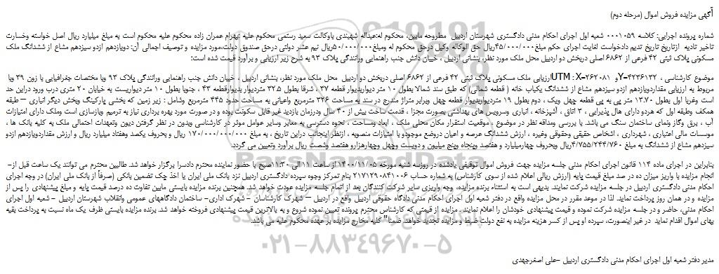 شماره پرونده اجرایی: کلاسه 0001059 شعبه اول اجرای احکام مدنی دادگستری شهرستان اردبیل مطروحه مابین، محکوم له:عبداله شهبندی باوکالت سعید رستمی محکوم علیه :بهرام عمران زاده محکوم علیه محکوم است به مبلغ میلیارد ریال اصل خواسته وخسارت تاخیر تادیه ازتاریخ تاریخ تدیم دادخواست لغایت اجرای حکم مبلغ45/000/000ریال حق الوکاله وکیل درحق محکوم له ومبلغ50/000/000ریال نیم عشر دولتی درحق صندوق دولت،مورد مزایده و توصیف اجمالی آن: دویازدهم ازدو سیزدهم مشاع از ششدانگ ملک مسکونی پلاک ثبتی 42 فرعی از 6862 اصلی دربخش دو اردبیل محل ملک مورد نظر، بنشانی اردبیل ، خیبان دانش جنب راهنمایی ورانندگی پلاک 93 به شرح زیر ارزیابی و برآورد قیمت شده است؛