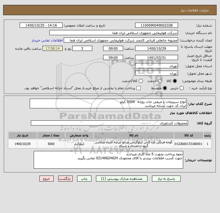 شرح کلی نیاز: انواع سبزیجات و صیفی جات روزانه 5000 کیلو