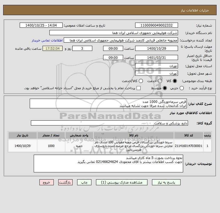 شرح کلی نیاز: قرص سرماخوردگی 1000 عدد