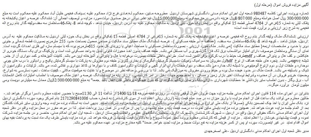 شماره پرونده اجرایی: کلاسه 980487 شعبه اول اجرای احکام مدنی دادگستری شهرستان اردبیل مطروحه مابین، محکوم له:هادی فرج نژاد محکوم علیه :سیامک فخیمی خلیل آباد محکوم علیه محکوم است به مبلغ 300/000/000 ریال اصل خواسته ومبلغ 8/807/000ریال هزینه دادرسی درحق محکوم له ومبلغ15/000/000ریال نیم عشر دولتی درحق صندوق دولت،مورد مزایده و توصیف اجمالی آن: ششدانگ عرصه و اعیان یکبابخانه به پلاک ثبتی به شماره 15فرعی از 4764 اصلی قطعه 15 تفکیکی واقع در بخش یک حوزه ثبتی اردبیل به مالکیت محکوم علیه به آدرس :اردبیل، خیابان شاهد ، کوچه شاهد 8، پلاک46،ساختمان سه سقف،وثیقه گذار بنام روح اله فخیمی به شرح زیر ارزیابی و برآورد قیمت شده است؛