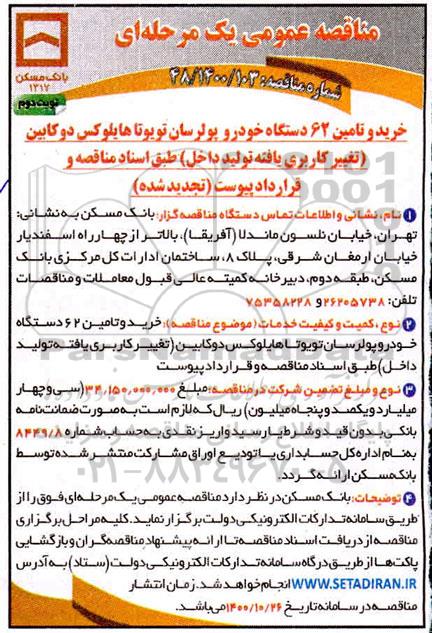 1. نام و نشانی و اطلاعات تماس دستگاه  مناقصه گزار: بانک مسکن به نشانی تهران، خیابان نلسون ماندلا (آفریقا)، بالاتر از چهارراه اسفندیار، خیابان ارمغان شرقی، پلاک 8، ساختمان ادارات کل مرکزی بانک مسکن، طبقه دوم دبیرخانه کمیته عالی قبول معاملات و مناقصات تلفن: 26205738 و 75358228