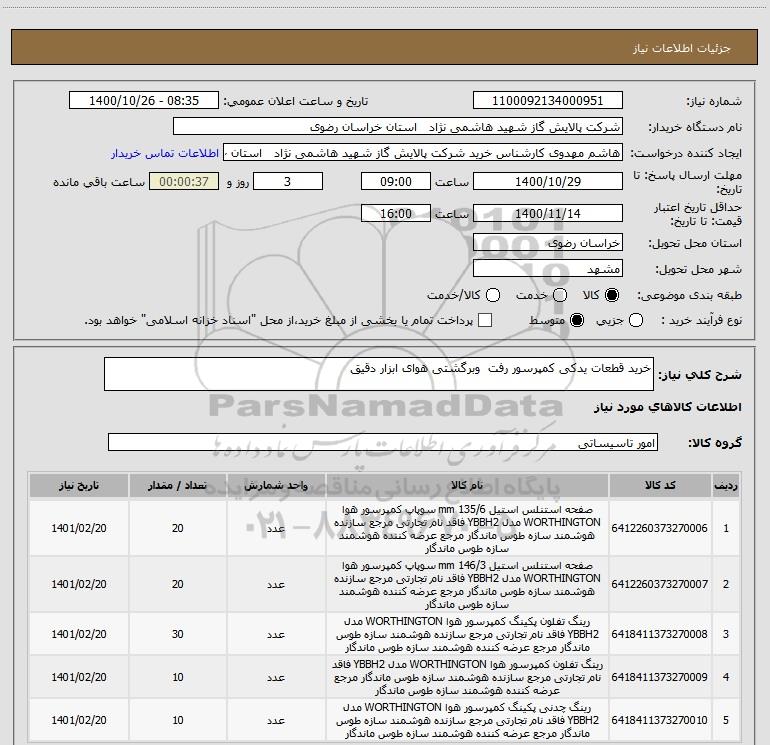 نام دستگاه خریدار:شرکت پالایش گاز شهید هاشمی نژاد استان خراسان رضوی