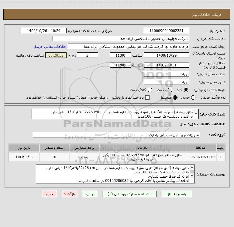 توضیحات خریدار:طلق پوشه (کاور مجله) طبق نمونه پیوست با آرم هما در سایز 32x26 cmوقطر1/10 میلی متر . به تعداد 50بسته هر بسته 100عدد. ایران کد صرفا جهت تشابه. اطلاعات بیشتر تماس با آقای گرجی نیا 09125286035 در ساعت اداری. نحوه پرداخت مالی 4 ماهه اداری.