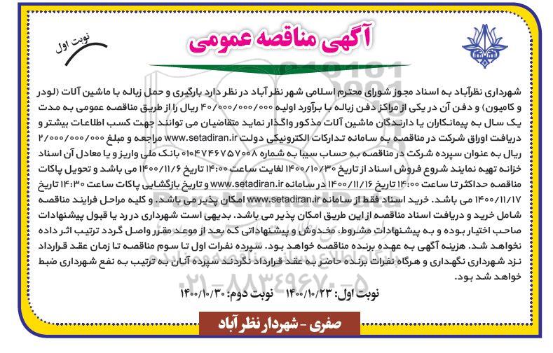 شهرداری نظرآباد در نظر دارد بارگیری و حمل زباله با ماشین آلات (لودر و کامیون) و دفن آن در یکی از مراکز دفن زباله با برآورد اولیه 40.000.000.000 ریال را از طریق مناقصه عمومی به مدت یک سال به پیمانکاران یا دارندگان ماشین آلات مذکور واگذار نماید. متقاضیان می توانند جهت کسب اطلاعات بیشتر و همچنین دریافت اوراق شرکت در مناقصه به سامانه ستاد مراجعه و مبلغ 2.000.000.000 ریال به عنوان سپرده شرکت در مناقصه به حساب سیبا به شماره 0104746757008 نزد بانک ملی واریز و یا معادل آن اسناد خزانه تهیه نمایند. شروع فروش اسناد از تاریخ 1400.10.30 لغایت ساعت 14 تاریخ 1400.11.6 می باشد و تحویل پاکات مناقصات حداکثر تا ساعت 14 مورخ 1400.11.16 در سامانه ستاد و تاریخ بازگشایی پاکات ساعت 14:30 مورخ 1400.11.17 می باشد. خرید اسناد فقط از طریق سامانه ستاد امکان پذیر می باشد. کلیه مراحل فرایند مناقصه شامل خرید و دریافت اسناد مناقصه از این طریق امکان پذیر می باشد. بدیهی است شهرداری در رد یا قبول پیشنهادات مختار بوده و به پیشنهادات مشروط، مخدوش و پیشنهاداتی که بعد از موعد مقرر واصل گردد، ترتیب اثر داده نخواهد شد. هزینه آگهی به عهده برنده مناقصه خواهد بود. سپرده نفرات اول تا سوم مناقصه تا زمان عقد قرارداد نزد شهرداری نگهداری و هرگاه نفرات برنده حاضر به عقد قرارداد نگردند، سپرده آنان به ترتیب به نفع شهرداری ضبط خواهد شد