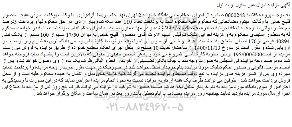 به موجب پرونده کلاسه 0000248 صادره از اجرای احکام مدنی دادگاه خانواده 2 تهران لها: خانم پریسا آزادواری با وکالت یوکابت بیرقی علیه: منصور قلیچ خانی با وکالت میثم رمضانخانی که محکوم علیه محکوم است به پرداخت تعداد 110 عدد سکه تمام بهار آزادی در حق محکوم لها و پرداخت 5درصد نیم عشر دولتی با توجه به اینکه اجرائیه صادره به محکوم علیه ابلاغ شده و در مهلت مقرر نسبت به اجرای حکم اقدام ننموده است بنا به در خواست محکوم له به منظور استیفای محکوم به و هزینه اجرایی ملک توقیفی سهم الارث آقای منصور قلیچ خانی به میزان 17/50 سهم از 100 سهم از پلاک ثبتی 40894 فرعی از170 اصلی متعلق به حشمت اله قلیچ خانی از سوی این اجرا توقیف و توسط کارشناس رسمی دادگستری به شرح زیر توصیف و ارزیابی شده و مقرر است در مورخ 1400/11/13 از ساعت9 لغایت 10 صبح در محل اجرای احکام مجتمع خانواده از طریق مزایده به فروش می رسد، مزایده از قیمت195/000/000 تومان نظریه کارشناسی شروع می شود و به هر شخص حقیقی و حقوقی که بالاترین قیمت را پیشنهاد نماید فروخته خواهد شد ده درصد وجه مزایده فی المجلس به صورت وجه نقد یا چک بانکی تضمینی از خریدار اخذ و الباقی ظرف یک ماه از وی وصول خواهد شد و پس از انجام مراحل قانونی و صدور حکم تملیک مورد مزایده بنام خریدار منتقل خواهد شد در صورتیکه در مهلت مقرر خریدار وجه مزایده را پرداخت ننماید سپرده وی پس از کسر هزینه های مزایده به نفع دولت ضبط و مزایده تجدید می گردد کلیه هزینه های نقل و انتقال به عهده محکوم علیه است و از محل فروش پرداخت خواهد شد . طرفین می توانند ظرف یک هفته از تاریخ مزایده نسبت به نحوه انجام مزایده اعتراض نمایند که در این صورت تا رسیدگی به اعتراض از سوی دادگاه مورد مزایده به نام خریدار منتقل نخواهد شد ضمنا طالبین به شرکت در مزایده می توانند ظرف پنج روز قبل از مزایده با اطلاع این اجرا از مال مورد مزایده بازدید نمایند چنانچه روز مزایده مصادف با ایام تعطیل باشد روز بعد در همان ساعت و مکان برگزار خواهد شد .