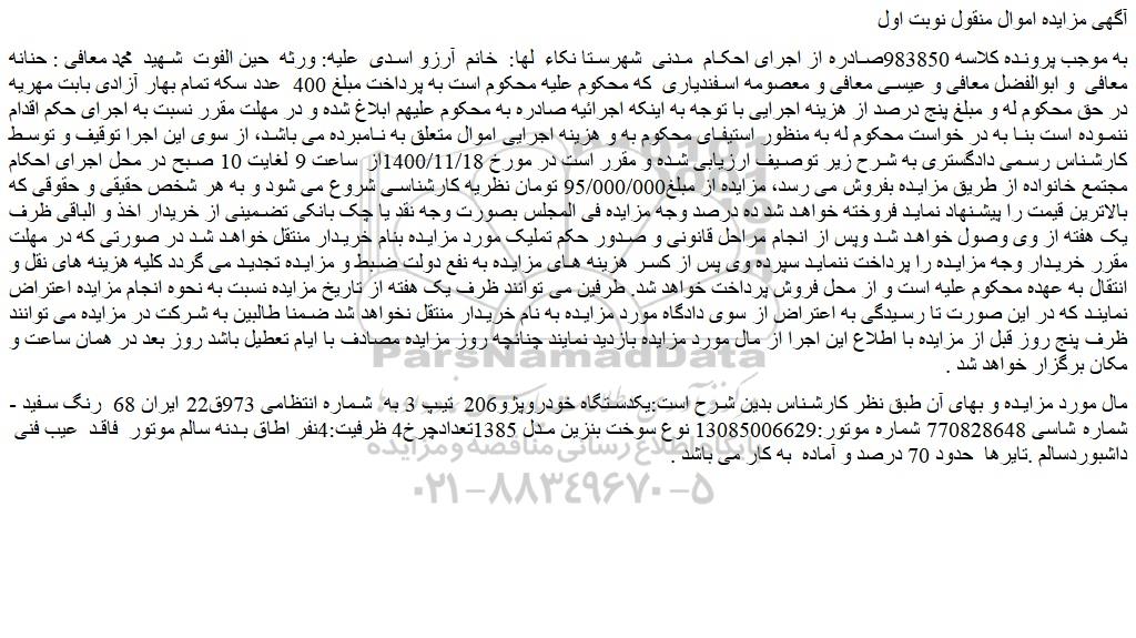به موجب پرونده کلاسه 983850صادره از اجرای احکام مدنی شهرستا نکاء لها: خانم آرزو اسدی علیه: ورثه حین الفوت شهید محمد معافی : حنانه معافی و ابوالفضل معافی و عیسی معافی و معصومه اسفندیاری که محکوم علیه محکوم است به پرداخت مبلغ 400 عدد سکه تمام بهار آزادی بابت مهریه در حق محکوم له و مبلغ پنج درصد از هزینه اجرایی با توجه به اینکه اجرائیه صادره به محکوم علیهم ابلاغ شده و در مهلت مقرر نسبت به اجرای حکم اقدام ننموده است بنا به در خواست محکوم له به منظور استیفای محکوم به و هزینه اجرایی اموال متعلق به نامبرده می باشد، از سوی این اجرا توقیف و توسط کارشناس رسمی دادگستری به شرح زیر توصیف ارزیابی شده و مقرر است در مورخ 1400/11/18از ساعت 9 لغایت 10 صبح در محل اجرای احکام مجتمع خانواده از طریق مزایده بفروش می رسد، مزایده از مبلغ95/000/000 تومان نظریه کارشناسی شروع می شود و به هر شخص حقیقی و حقوقی که بالاترین قیمت را پیشنهاد نماید فروخته خواهد شد ده درصد وجه مزایده فی المجلس بصورت وجه نقد یا چک بانکی تضمینی از خریدار اخذ و الباقی ظرف یک هفته از وی وصول خواهد شد وپس از انجام مراحل قانونی و صدور حکم تملیک مورد مزایده بنام خریدار منتقل خواهد شد در صورتی که در مهلت مقرر خریدار وجه مزایده را پرداخت ننماید سپرده وی پس از کسر هزینه های مزایده به نفع دولت ضبط و مزایده تجدید می گردد کلیه هزینه های نقل و انتقال به عهده محکوم علیه است و از محل فروش پرداخت خواهد شد. طرفین می توانند ظرف یک هفته از تاریخ مزایده نسبت به نحوه انجام مزایده اعتراض نمایند که در این صورت تا رسیدگی به اعتراض از سوی دادگاه مورد مزایده به نام خریدار منتقل نخواهد شد ضمنا طالبین به شرکت در مزایده می توانند ظرف پنج روز قبل از مزایده با اطلاع این اجرا از مال مورد مزایده بازدید نمایند چنانچه روز مزایده مصادف با ایام تعطیل باشد روز بعد در همان ساعت و مکان برگزار خواهد شد .