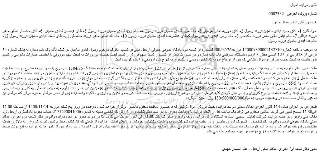 به موجب دادنامه شماره 140007390002132710 مورخه1400/07/26صادره از شعبه دوم دادگاه عمومی حقوقی اردبیل مبنی بر تقسیم ماترک مرحوم رسول قبادی سامیان در ششدانگ یک باب مغازه به پلاک شماره ۲۰ فرعی از 18فرعی از 127 اصلی بخش 3 اردبیل باستثناء سرقفلی یک باب مغازه و در صورت تعذر از تقسیم و تعدیل سهم فروش و تقسیم قیمت حاصله بین وراث به نسبت سهم موروثی با احتساب خسارات دادرسی و تقسیم ثمن حاصله به نسبت حصه طرفین ازاموال مشاعی که پس از ارجاع امربه کارشناس رسمی دادگستری به شرح ذیل ارزیابی و اعلام گردیده است.
