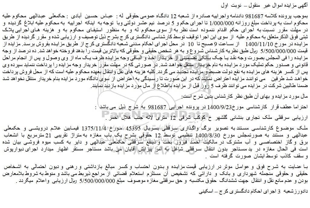 بموجب پرونده کلاسه 981687 دادنامه واجراییه صادره از شعبه 12 دادگاه عمومی حقوقی  له :  عباس  حسین  آبادی  : حکمعلی  عبدالهی  محکوم علیه محکوم است به پرداخت مبلغ روزانه 1/000/000 تا اجرای حکم و 5 درصد  نیم عشر دولتی وبا  توجه به  اینکه  اجراییه  به محکوم علیه ابلاغ  گردیده  و در مهلت  مقرر  نسبت به  اجرای  حکم  اقدام  ننموده  است نظر به از سوی محکوم  له  و  به  منظور  استیفای  محکوم  به  و  هزینه  های اجرایی پلاک ثبتی فوق الذکرمتعلق به محکوم علیه  از سوی این اجرا توقیف توسط کارشناسی دادگستری کرج بشرح ذیل توصیف و ارزیابی شده و مقرر گردیده از طریق مزایده در مورخ 1400/11/10    از ساعت 9 صبح تا  10  در محل اجرای احکام مدنی شعبه دادگستری کرج از طریق مزایده بفروش برسد. مزایده از قیمت 5/500/000/000  ریال طبق نظریه کارشناس شروع و به هر شخص حقیقی و حقوقی که بالاترین قیمت را بدهد فروخته خواهد شد. ده درصد از وجه مزایده را فی المجلس بصورت وجه نقد یا چک بانکی تضمینی از خریدار اخذ و الباقی وجه مزایده ظرف یک ماه از وی وصول و پس از انجام مراحل قانونی و صدور حکم تملیک مورد مزایده به نام خریدار منتقل خواهد شد. در صورتی که در مهلت مقرر خریدار وجه مزایده را پرداخت ننماید سپرده وی پس از کسر هزینه های مزایده به نفع دولت ضبط و مزایده تجدید می گردد. کلیه هزینه های نقل وانتقال بعهده محکوم علیه است که از محل فروش پرداخت خواهد شد طرفین    می توانند مزایده اعتراض نمایند که در این صورت تا رسیدگی به اعتراض از سوی دادگاه مورد مزایده بنام خریدار منتقل نخواهد شد ضمنا طالبین شرکت در مزایده می توانند ظرف 5 روز قبل از مزایده بااطلاع از مال مورد مزایده بازدید نمایند.