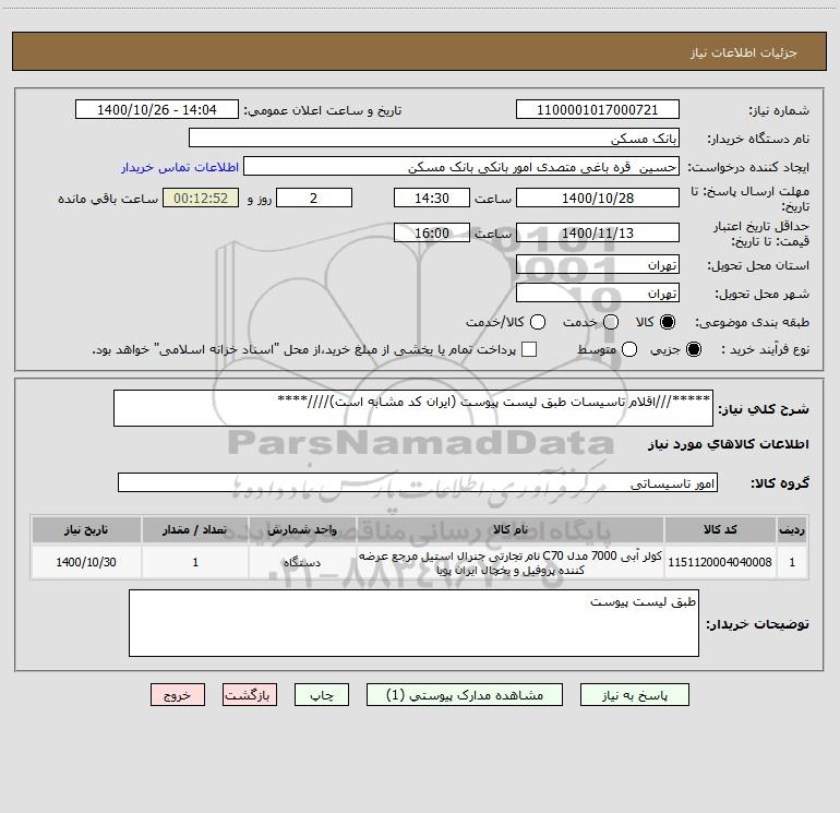شرح کلی نیاز: *****///اقلام تاسیسات طبق لیست پیوست (ایران کد مشابه است)////****