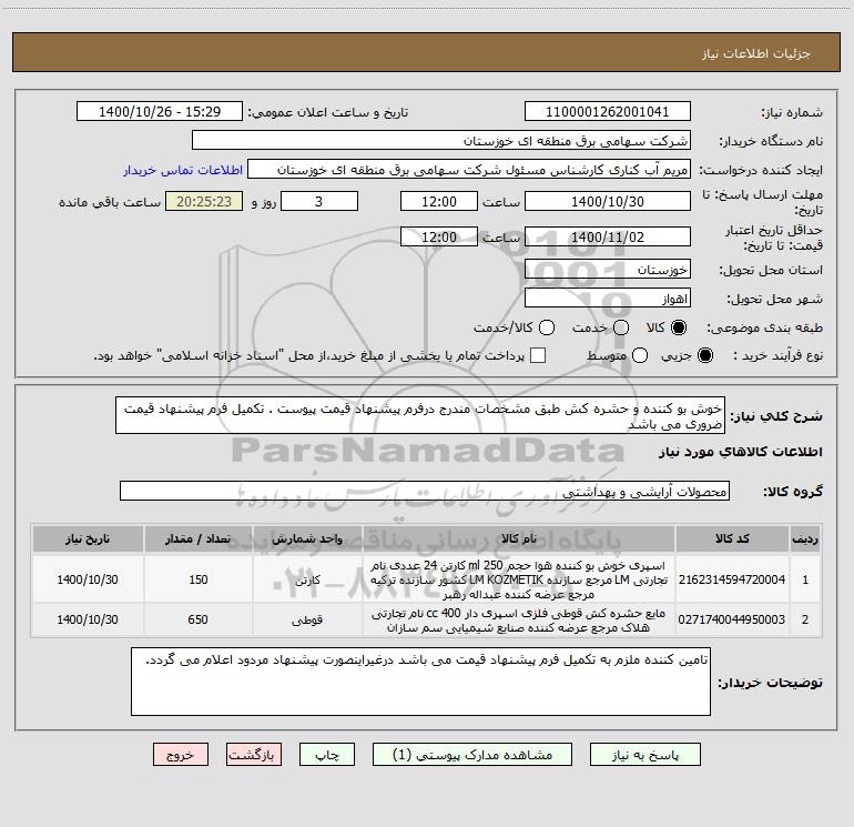 شرح کلی نیاز: خوش بو کننده و حشره کش طبق مشخصات مندرج درفرم پیشنهاد قیمت پیوست . تکمیل فرم پیشنهاد قیمت ضروری می باشد