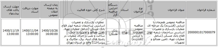 2000001017000079 | مناقصه عمومی همزمان با ارزیابی (فشرده) یک مرحله ای عملیات بازسازی و تعمیرات اساسی ساختمان شعبه ابوذر فلاح بانک مسکن (شامل عملیات تهیه، تامین مصالح و تجهیزات | مناقصه عمومی همزمان با ارزیابی (فشرده) | تهران | بانک مسکن | عملیات بازسازی و تعمیرات اساسی ساختمان شعبه ابوذر فلاح بانک مسکن (شامل عملیات تهیه، تامین مصالح و تجهیزات، حمل، ساخت و نصب و اجرای عملیات در رشته های ابنیه، برق، مکانیک و زیرساخت) واقع در استان تهران. | 1400/10/26 16:00:00 | 1400/11/04 13:00:00 | 1400/11/19 13:00:00 |