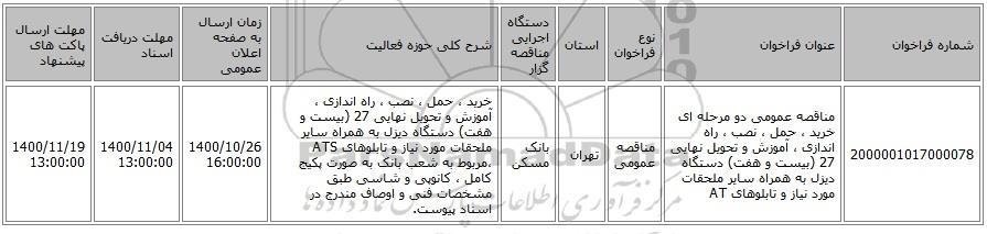 2000001017000078 | مناقصه عمومی دو مرحله ای خرید ، حمل ، نصب ، راه اندازی ، آموزش و تحویل نهایی 27 (بیست و هفت) دستگاه دیزل به همراه سایر ملحقات مورد نیاز و تابلوهای AT | مناقصه عمومی | تهران | بانک مسکن | خرید ، حمل ، نصب ، راه اندازی ، آموزش و تحویل نهایی 27 (بیست و هفت) دستگاه دیزل به همراه سایر ملحقات مورد نیاز و تابلوهای ATS ،مربوط به شعب بانک به صورت پکیج کامل ، کانوپی و شاسی طبق مشخصات فنی و اوصاف مندرج در اسناد پیوست. | 1400/10/26 16:00:00 | 1400/11/04 13:00:00 | 1400/11/19 13:00:00 |