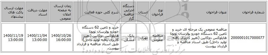 2000001017000077 | مناقصه عمومی یک مرحله ای خرید و تامین 62 دستگاه خودرو پولرسان تویوتا هایلوکس دوکابین (تغییر کاربری یافته تولید داخل) طبق اسناد مناقصه و قرارداد پیوست | مناقصه عمومی | تهران | بانک مسکن | خرید و تامین 62 دستگاه خودرو پولرسان تویوتا هایلوکس دوکابین (تغییر کاربری یافته تولید داخل) طبق اسناد مناقصه و قرارداد پیوست. | 1400/10/26 16:00:00 | 1400/11/04 13:00:00 | 1400/11/19 13:00:00 |