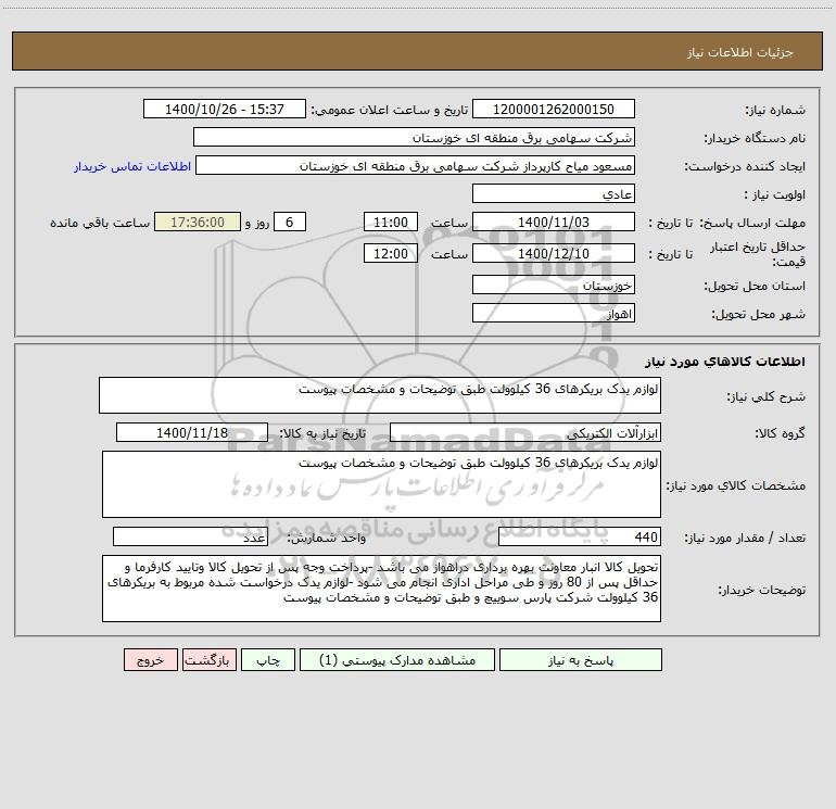 توضیحات خریدار:تحویل کالا انبار معاونت بهره برداری دراهواز می باشد -پرداخت وجه پس از تحویل کالا وتایید کارفرما و حداقل پس از 80 روز و طی مراحل اداری انجام می شود -لوازم یدک درخواست شده مربوط به بریکرهای 36 کیلوولت شرکت پارس سوییچ و طبق توضیحات و مشخصات پیوست