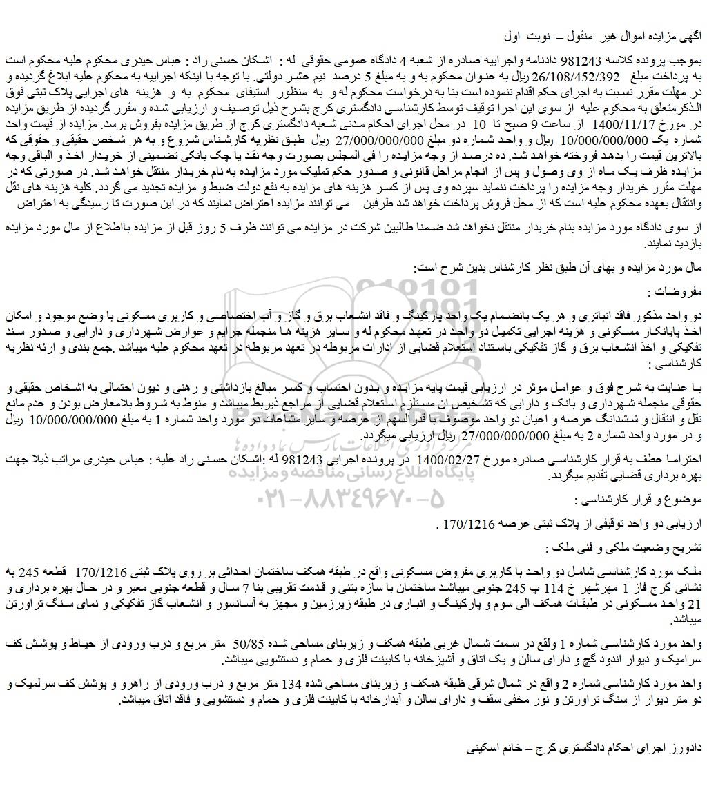بموجب پرونده کلاسه 981243 دادنامه واجراییه صادره از شعبه 4 دادگاه عمومی حقوقی  له :  اشکان حسنی راد : عباس حیدری محکوم علیه محکوم است به پرداخت مبلغ   26/108/452/392 ریال به عنوان محکوم به و به مبلغ 5 درصد  نیم عشر دولتی. با توجه با اینکه اجراییه به محکوم علیه ابلاغ گردیده و در مهلت مقرر نسبت به اجرای حکم اقدام ننموده است بنا به درخواست محکوم له و  به  منظور  استیفای  محکوم  به  و  هزینه  های اجرایی پلاک ثبتی فوق الذکرمتعلق به محکوم علیه  از سوی این اجرا توقیف توسط کارشناسی دادگستری کرج بشرح ذیل توصیف و ارزیابی شده و مقرر گردیده از طریق مزایده در مورخ 1400/11/17  از ساعت 9 صبح تا  10  در محل اجرای احکام مدنی شعبه دادگستری کرج از طریق مزایده بفروش برسد. مزایده از قیمت واحد شماره یک 10/000/000/000  ریال و واحد شماره دو مبلغ 27/000/000/000  ریال  طبق نظریه کارشناس شروع و به هر شخص حقیقی و حقوقی که بالاترین قیمت را بدهد فروخته خواهد شد. ده درصد از وجه مزایده را فی المجلس بصورت وجه نقد یا چک بانکی تضمینی از خریدار اخذ و الباقی وجه مزایده ظرف یک ماه از وی وصول و پس از انجام مراحل قانونی و صدور حکم تملیک مورد مزایده به نام خریدار منتقل خواهد شد. در صورتی که در مهلت مقرر خریدار وجه مزایده را پرداخت ننماید سپرده وی پس از کسر هزینه های مزایده به نفع دولت ضبط و مزایده تجدید می گردد. کلیه هزینه های نقل وانتقال بعهده محکوم علیه است که از محل فروش پرداخت خواهد شد طرفین    می توانند مزایده اعتراض نمایند که در این صورت تا رسیدگی به اعتراض
