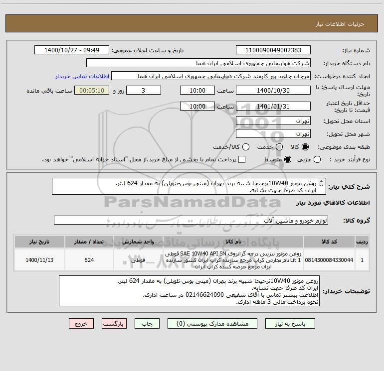 توضیحات خریدار:روغن موتور 10W40ترجیحا شبیه برند بهران (مینی بوس-نئوپلن) به مقدار 624 لیتر. ایران کد صرفا جهت تشابه. اطلاعت بیشتر تماس با آقای شفیعی 02146624090 در ساعت اداری. نحوه پرداخت مالی 3 ماهه اداری.