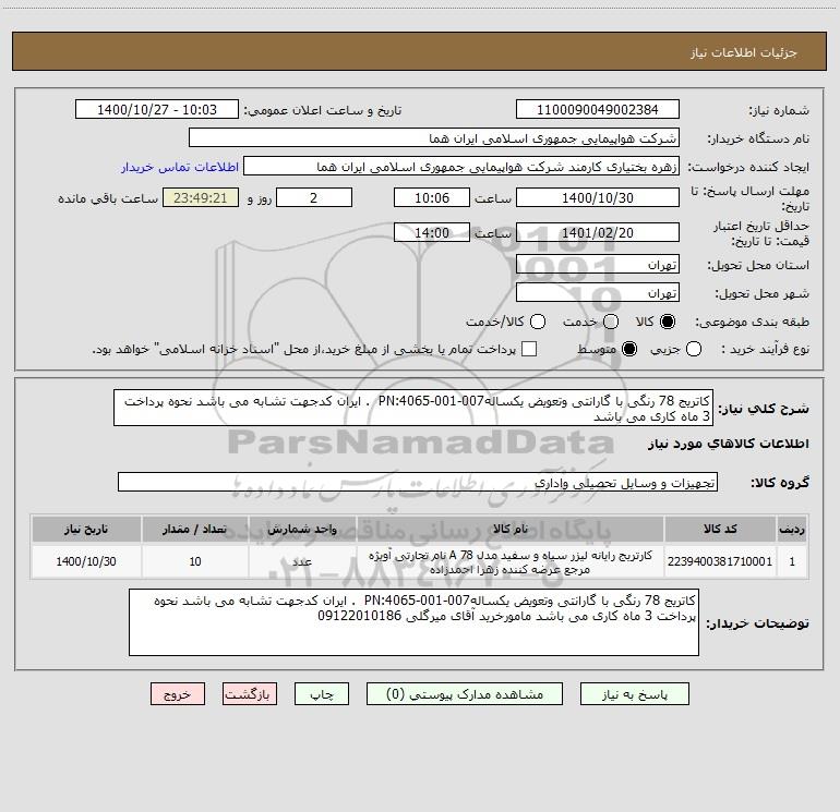 شرح کلی نیاز: کاتریج 78 رنگی با گارانتی وتعویض یکسالهPN:4065-001-007 . ایران کدجهت تشابه می باشد نحوه پرداخت 3 ماه کاری می باشد